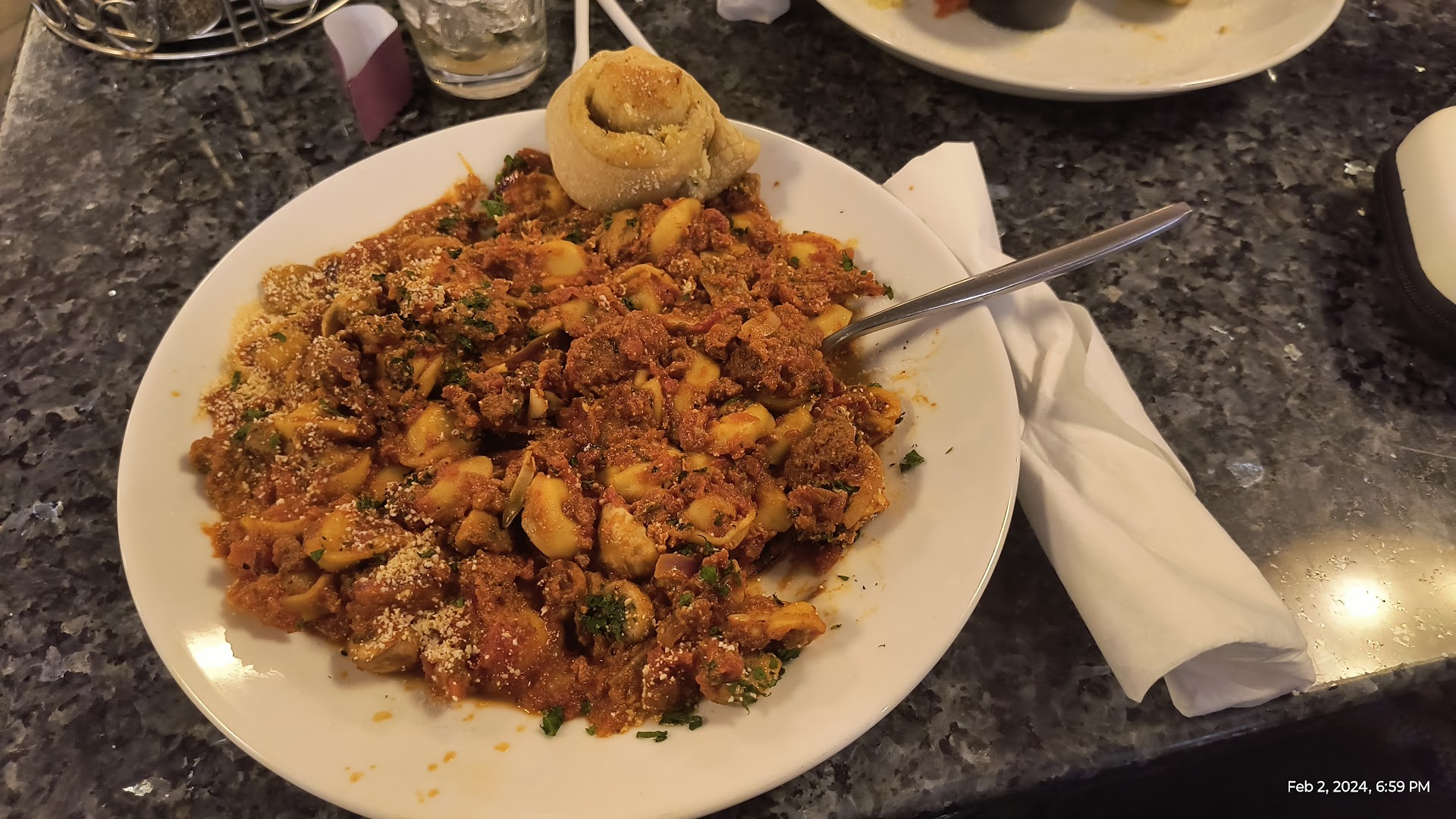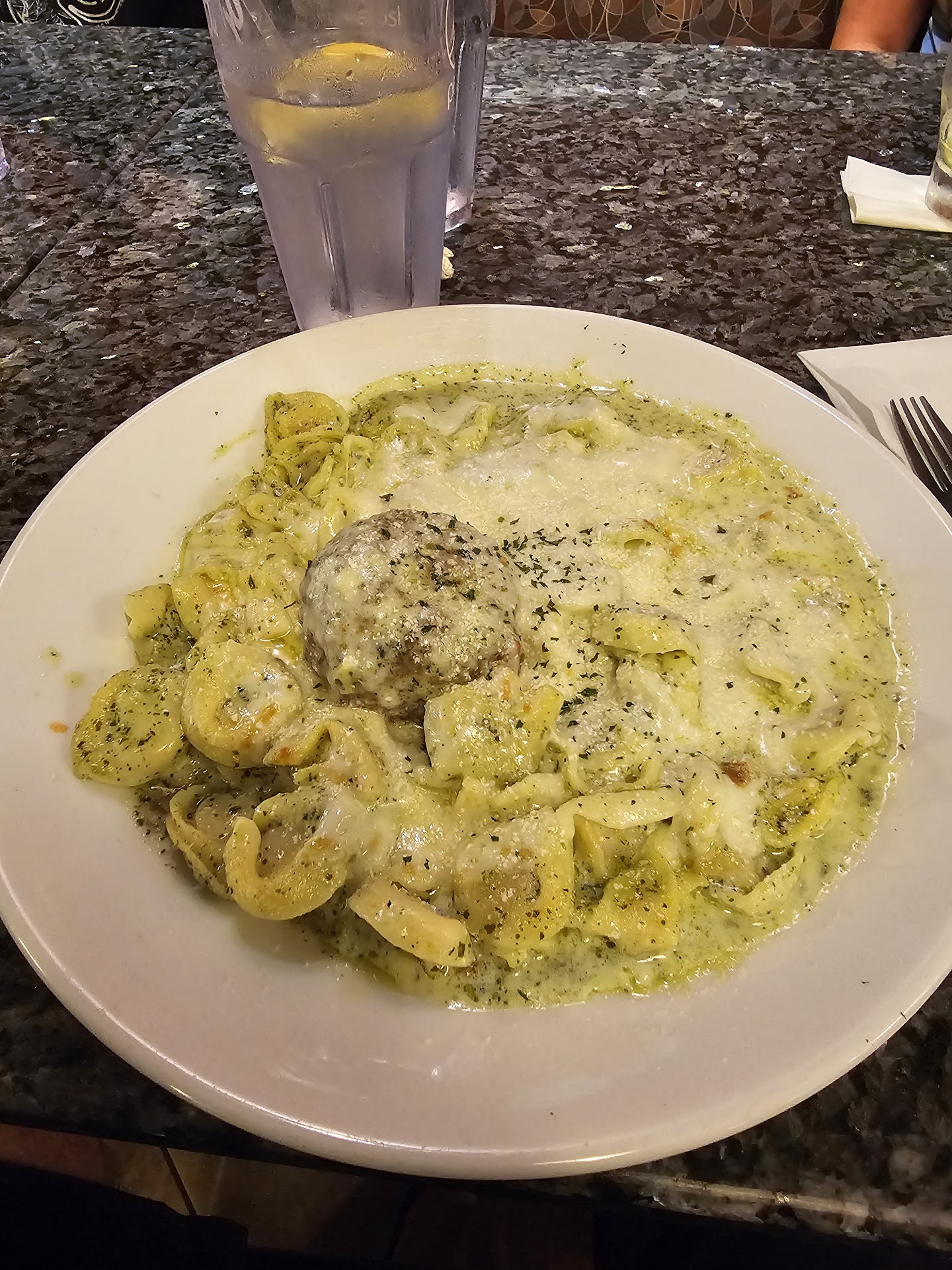 Lets talk about the food. The salad was obviously pre-made and stacked on top of each other, the lettuce was flat and the dressing in a plastic ramekin was bland. Our app was the calamari. This was bland at best. The marinara sauce seemed watery and tasteless. We both had chicken parmigiana. My wife with spaghetti, and i with tortellini. My order seemed to confuse the waitress who came back three times to tell me the pasta I wanted was not available with that dish. Tortellini was my last choice. The parmigiana as well was bland. The serving size was awesome though, they don't skimp on quantity. They do on quality. My pasta was cold, the marinara again was watery, overly sweet and lacking spices. Kind of like stewed tomatoes.
