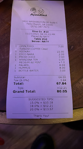 In summary, AFANDINA hookah lounge exceeded my expectations in every aspect. It's not just a place to enjoy a hookah; it's an immersive experience crafted by a dedicated owner who understands the importance of hospitality. I highly recommend anyone seeking a delightful and memorable hookah experience to pay a visit to AFANDINA...