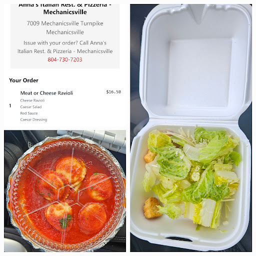 Read moreMy first time eating here. I got take out. I was disappointed before I left the parking lot. The salad looks awful. Yellow Lettuce. It's going in the trash. I'll recycle the styrofoam. Essentially, I'm recycling the salad too because it's not edible. 6 pieces of ravioli for $17.00. A homecare patient recommended Amna's. She said they eat there all the time. This is my first and last time getting food from Anna's. It was a waste of time and money. Not enough food for one person. The receipt said to call for issues w/the food. I called and waited while Anna, the owner came to the phone. She offered to make me something else, but I wasn't turning around. I was already half way back to Short Pump, tired, and had just seen two homecare patients. Ultimately, I told Anna I'd just post a review. She responded by saying "Reviews, it's always the reviews. Thank you." She hung up without allowing me to utter another word, but not before confirming that the ravioli dinner is 6 pieces for $17.00. My questions would have been how many are in a kids meal for $12.00? I've had better treatment from management at a fast food restaurant. So, a yellow inedible salad (Do the count the croutons too? lol), 6 pieces of ravioli for $17.00 , not enough food for one person, and poor service from management. I'll go where I"ve been going. Napolli's in Short Pump. Yes, Anna it is kind of about the reviews, the customer...
