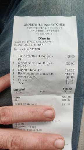 Read moreMy wife heard about Annie's Indian Kitchen from a co-worker that advised if we enjoy Indian cuisine this place is a must. We love food from various cultures and enjoy trying new restaurants. Today we decided to venture into Annie's. The first impression is that this restaurant is strictly take out, but the eat in area is in the back. The chef/owner met us with a smile, made some recommendations and gave us samples to try to ensure we would be satisfied with the selections. Once we ordered, we went to the back and sat down. Someone already pointed out the type of dinnerware you receive, however the taste of the food and the hospitality of the owner and staff were wonderful! Prince does like to make recommendations on how to eat the dishes he presents. For us, this was interpreted as being passionate about his food. Honestly, this was the best Indian food we have had in Lynchburg! We ordered the Chicken Chili, fresh caught salmon with a butter curry sauce, rice, bread and yogurt sauce. It was all AMAZING! One thing to note when ordering is that food items are ordered separately which is where the cost can increase. We plan to return and enjoy their...