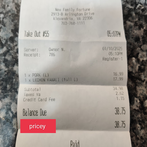 Read moreI don't care about the other comments here I love there Orange Chicken. Very Iarge pieces of white meat cooked to perfection in a very sweet sauce. I had a very negative experience at another Chinese Carryout. It was the wrong Order it was Spicy chicken and broccoli when I went to complain the lady said that's what I asked for when I showed her the spicy red peppers and how dark the sauce was she changed her story and said this was there orange chicken even though I lived in the Fort HUNT area for 33 years and have ordered orange chicken from them before she just didn't want to accept that she made a mistake and didn't want to give me another order or even offer to return my money.