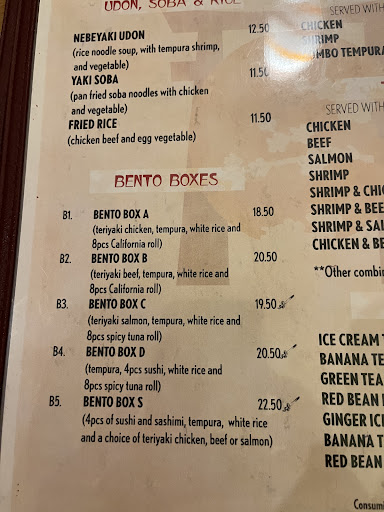 The menu prices are NOT accurate unless you play a game of seek & find with the back page, which is the only place on the menu that reflects accurate pricing. So, find what sounds good on the first few pages, then flip to the back page & try to find the name of the item you’re considering to see the current cost. And don’t miss the details about dinners no longer including soup or salad, or the $1 upcharge for extra ginger and wasabi.