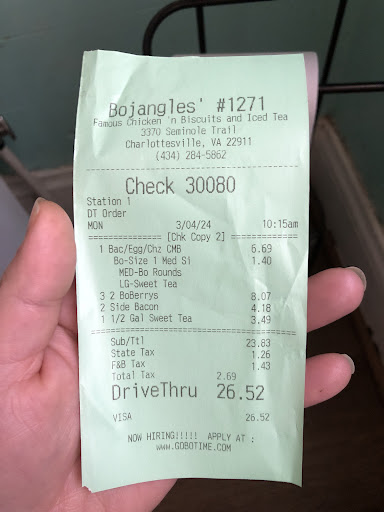 Today I had an extremely bad experience at Bojangles on Seminole Trail in Charlottesville Va. I went through the drive thru and ordered a bacon, egg and Cheese biscuit combo with a large sweet tea. A sausage and egg biscuit. A side of bacon, 6 Bo berry biscuits and a 1/2 gallon sweet tea. She was very distracted taking my order and asked her a few times did she get everything and she said yes. I drive around and she gives me the total $26.52. It sounded close so I gave her my card and she handed me my large tea and card back with no receipt and tells me to pull up and wait. I’m sitting there for 12 minutes and decided to ride around again and ask what was taking so long as several cars had gone through after. She said they were making fresh Bo berry biscuits. After 5 more minutes of waiting she brings out the bags and the receipt was on the bag. I look through my stuff and notice that there is no sausage and egg biscuit. So I check the receipt. She never rang it up and then I find she double charged my for and order of bacon that was not in there and had over charged me for the biscuits by ringing up 3 individual orders of 2. There is a price difference where 6 cost $6.99! Ordering them depot came to $8.07 before tax. How many other customers do they do this too that don’t take the time to look? I went back in and explained this to the assistant manager Trish and she never apologized but simply said well I will have to refunded every and ring it all back up again and charge the correct prices. This would be charging me double and I would have to wait 3-5 days for the refund to process. This was poor customer service. I asked her could she just give me the sausage and egg biscuit and call it a day and she said no because it will mess our inventory up. Then I offered to pay the difference and she tried to charge me $3.55 for the biscuit alone. Where is the price difference for to w mistakes that you all already made? After dealing with this 25 minutes I just asked for a complete refund and gave all the food back as this made me not want to give my business to them ever. How many other customers are being over charged by bojangles!? At no point was any apology given by anyone at to is established for their careless errors. Poor...