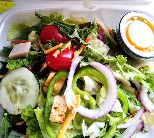 Lightening fast service today for lunch! Food was delicious, and serving sizes were plentiful. It was raining, so didn't eat outside, but there's a nice umbrella shaded patio which is very pleasant and usually cool on a hot day. Prices are reasonable and staff are cordial. The menu is varied, ranging from different salads, to subs/sandwiches to more dinner entree type dishes. My favs are the nachos (which you can make a half order if you like), the chef salad ( filled with lots a deli meats, cheeses, veggies and croutons) and if course the BD Special, a varied meaty sub with slaw and cheeses. Overall, good service, friendly staff, large menu, and tasty dishes!