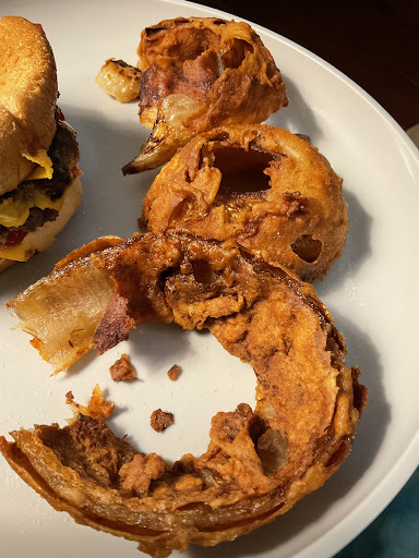 So the first thing I ordered was the cry and fry. It is the onion rings and the French fries together. The first thing I chose was the onion ring and I have to say the crunch is perfect, the flavor of the onion is perfect, but the flavor of the batter is just a little off from what I expected after having eaten onion rings all my life everywhere else. Now I got over that by eating the second one and realized that it's just a slightly different flavor than normal, but it's actually pretty darn good. I would have to give the onion rings here. A would recommend minus.