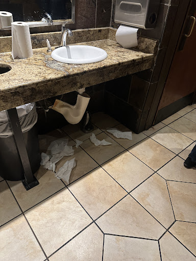 I asked to have it removed and she got annoyed with me. Didn't remove it. Im over it by this point, we pay and head to the bathroom before leaving, and the bathroom was absolutely disgusting. My husband tells me the mens smelled like old urine that had been sitting a long time, and both bathrooms had broken doors on the toilet stalls, toilet paper everywhere, and soap poured on the floor.