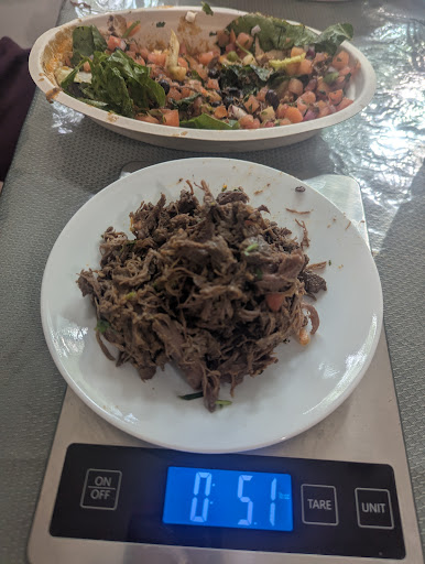 Read moreThis review probably applies to many Chipotle locations, not just this one, but I recommend everyone keep a mini food scale if they want to go to Chipotle. They underserve the portion of the protein by almost 50%. It's ridiculous! I really like Chipotle because you can build a healthy meal, but as someone who tracks their macros, this really upsets me. I weigh my food constantly and when we were being served I knew they were ripping us off. However, I didn't have a scale to prove this so I let it be. As soon as I got home I pulled out my food scale and weighed our portions. Mind you, a regular protein portion per Chipotle's website is 4oz and a double 8oz (you pay extra for this too). Please see pictures of our regular order coming in at a measly 2.6 oz and our double portion that should have been 8 oz weighing in 5.2oz. Meaning they consistently underserve!!! Ripoff! If you are someone who tracks their macros or are tracking your protein intake know Chipotle is happy to over charge you and...