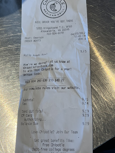 Read moreI am writing this review due to the horrible experience I encountered at the Kingstowne chipotle. Normally I always have a great experience but this time I did not which is why i am writing this review. I came with my sister because we were craving chipotle around 9 before closing time. We thought they still have an hour before closing. When we came in, a young lady that had a butterfly tattoo on the front of her neck was cleaning the glass in front of the food. She did not acknowledge us while we stood there for 5 minutes until her coworker came out and he did not say anything to us either. He asked what we wanted and proceeded to serve our food. Meanwhile the food was still pushed back and the girl was still cleaning the glass windows(where the food should be) now there was a line behind us. She was taking her sweet time and her and the one that was serving us were just pretty much having their own side conversation about him leaving early, again while not acknowledging the customers.Then after, she was serving us, she gave my sister and I an attitude complaining to her coworker about serving the customers. Which I did not take likely. The guy checking us out with glasses also not having a care in the world, asked “anything else?” I said a fountain drink and he slammed down the cup in which did not land right and ended up falling to the floor. Much to say, I had the worst experience there. If they can next time actually clean I don’t know 15 minutes before closing time, then there wouldn’t be this bad review on those three employees . Also if they can acknowledge customers when they come in and leave they would have more customers coming back. They should hire people that actually want to work and not people who want to mess around. It’s a business, they should...