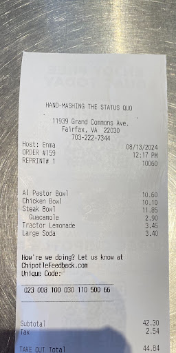What a terrible experience we had during lunchtime today at this Fairfax Chipotle location. The meat portions were really small, as if they were doing us a favor by giving us any at all. We ordered a small fountain soda but were told they were out of small cups and were given a large cup instead, for which we were charged. When I asked the cashier why we were being charged for a large soda when they were out of small cups, she was joined by another employee, possibly a supervisor. They both stated that they only had large cups in stock, so if we wanted soda, we had to pay for the large size. There were no smiles, no apologies—just rude and unprofessional behavior. I paid for the large soda (receipt attached) and told them I would inform the corporate office about the situation. They seemed indifferent and simply moved on to the next customer. The store was also very unclean, and I’m extremely disappointed. If there were an option to give zero...