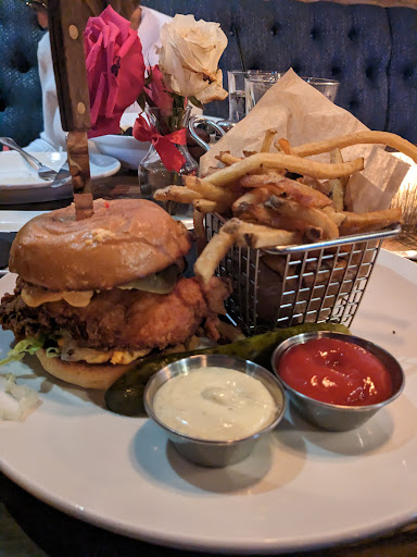 Read moreHad dinner here on Valentine's Day. To be honest, it wasn't our first choice, but we're very glad we were able to enjoy a nice last minute V Day dinner here! They had a special menu for the day, where we could pick one app and one dessert to share and choice of two entrees from a selection of their usual offerings, but we opted to go for different apps and desserts. We got the elote corn dip (amazing) and I got their hefeweizen on tap, which was a very nice choice for beer; very smooth with hints of fruitiness. For entrees we got their spicy chicken sandwich that came with fries, a kids cheeseburger with fries, and the seafood pasta which came with mussels and shrimp. The chicken sandwich was good, it had a couple of tenders with a simple flour breading with a spicy sauce. Don't expect it to be like a certain famous chicken fast food spot's sandwich, but it was satisfying nonetheless. Our kid loved the cheeseburger, fries are shoestring, seasoned to perfection. Seafood pasta was also good, a little light on seasoning but nothing an extra sprinkle of salt couldn't fix. Plus the addition of some parmesan cheese and red chili flakes brought it to life. For dessert we got their loaded root beer float, which came with a dark chocolate cake and waffle. It's kinda in the style of one of those Instagram-bait milkshakes. I have to say, the float is great. The cake was heavy with the chocolate, almost like a fudge brownie consistency. The waffle was a perfect touch, dipping it in the root beer and ice cream was a dangerous but tasty combo.