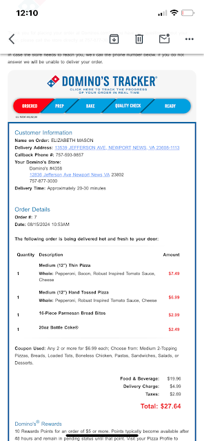 Read moreWill be contacting corporate first thing in morning. The location at 15439 Warwick Blvd (Newport News, VA) - STORE # 4302 is horrible and so called manager Nancy J. is the worse. Ordered 2 pizzas via the confusing Dominos app. One of the pizzas I did as a half-n-half but did not know philly cheesesteak pizza came with no tomato sauce or mozzerella cheese. So one half is philly cheesesteak and other half is only bacon and sausage on a tomato sauce-less and no cheese at all crust. I called to see if I could get the pizza replaced. The so called Manager Nancy J. just kept saying I could place an entire new order that I would have to pay for. I asked for the phone number to corporate and she said she doesn't know it and I can find it online. SMH! My husband even called back because I was so irritated and she was still unwilling to do anything. We live in Williamsburg and always order online and pick up our order from the Dominos on Merrimac Trail which is WONDERFUL. Had I known delivery came from this 15439 Warwick Blvd (Newport News) location, I would have just went to Merrimac Trail (Williamsburg) location. So much for making a customer happy. Horrible, horrible management!! Never again!...