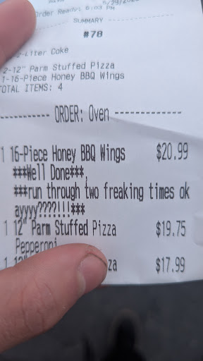 Ā Ā Ā Read moreStopped in and ordered three pizzas, parmigiana bites and marinara and cheese dip. Waited for my food and then was given two of the pizzas I ordered and one I did not, the bites and no dip. To the guy one of my pizzas was completely wrong and the dip was missing. He put it back on the rack and put a bow on it and said what I thought was thereās the dip and that one of the drivers mustāve take the wrong pizza. Waited 10 minutes for the missing pizza and when I went to check my order there looked to be a calzone or something in the box the dip was supposed to be in. Then he tried to hand me a marinara cup which is completely different from the marinara and cheese dip. Now that Iām completely aggravated he the tried to say I ordered the wrong thing. Again marinara and cheese dip is a completely different menu item that the marinara cup. Needless to say I left with some food that had to sit while he replaced a missing item and without an item I ordered. Another place gone downhill due to poor hiring and lack of management. If you roll the dice and order from this store you better check it...