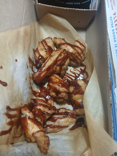 Read moreI love me some domino's but when I want some wings........ 😬 I don't even know why yall give the option for "sauced" wings when this is what yall do to them and then have the nerve to charge us for a sauce!? Toss the dang wings in a bowl or something or at least squirt some dang sauce on the wings! I have been here once before for wings and I did the window pick up. Had to walk back inside (after I checked to make sure everything was ok) they did remedy the issue but what the heck can I do when I get delivery!? I forgot to add that I ordered the drink bundle,which is supposed to be 4 sodas, and I only got 3. Just called the store, and it took about 6 min for someone to answer. He told me he would put me through to the manager,after waiting hold for another 5 mins the phone...