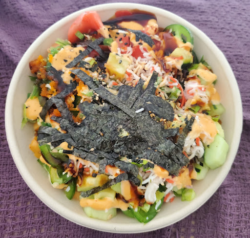 We used the self-order kiosk to place our to-go order. The kiosk is pretty simple and easy to use. I ordered a 2 protein rice bowl with brown rice, lettuce, crab salad, shrimp, salmon, mangos, ginger with eel and sweet Thai sauce. You can pick up to 12 add-ins and 2 sauces. My husband ordered a 2 protein rice bowl with white rice, lettuce, shrimp, chicken, seaweed salad, crab salad, yum yum sauce and eel sauce.