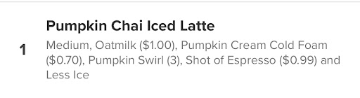 Read moreI typically don’t leave reviews, but today my inner basic b decided to take over. I order coffee almost EVERY DAY before work (Amazon, right behind the building), and usually it’s perfect. Today- not so much. I enjoy a “dirty” chai every now & again, so I figured I’d get my usual order (usually a cold brew with cold foam) in chai form with cold foam and an extra shot of espresso. I recieved this, and the woman working about RAN out of the window when I looked a little confused as to what she was handing me. If I pay extra for something, I’m expecting that something to be included in/with my drink, especially when it’s almost a dollar to add it.