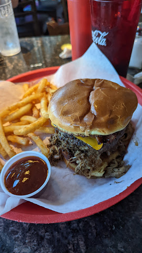 I ordered the Grub burger, my son had the House burger. The Grub burger was PACKED with pulled pork and bacon, topped with a very juicy, thick hamburger cooked medium to perfection! It came with a side BBQ sauce, which was perfect sweet and tang to add to the burger and pork. If you're gonna tackle this thing, bring an appetite!! Only downside is the pork being on the bottom made the bun soft and it fell apart... But it was worth the mess!