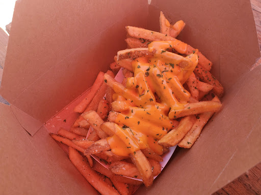 The food here is incredibly delicious! I've had the Veggie Sando, their regular seasoned fries and their giant pretzel. -The Veggie Sando is a vegetarian "sausage" on a hotdog bun with ketchup, mustard, onions and peppers. I'm not always in the mood for onions so sometimes I get it without the onions, however be aware that if you get it without onions they also leave off the peppers. Apparently they store the onions and peppers mixed together so you can either get both or neither. The vegan sausage is incredibly delicious and doesn't taste too close to actual meat. If you are a vegetarian like myself who doesn't like how meat tastes, you will probably find this "sausage" different enough from a real sausage to find enjoyable. -The regular French fries come seasoned. They are delicious. Very flavorful. Among the best fries I've had (and I'm somewhat of a fry connoisseur). Contrary to what their website says you can only get the fries in one size. It is a large size and good for sharing. -Their big soft pretzel is by far the best soft pretzel I've ever eaten. The bread is so fluffy and there is just the right amount of salt. The pretzel comes with a couple containers of things to dip the pretzel in. One is a delicious cheese sauce. I also enjoy dipping my fries in this sauce. And I didn't try the second sauce, but probably will on a future visit.