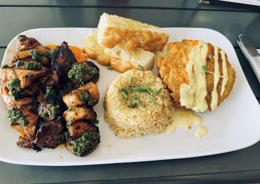 I ordered the Pincho Sampler—featuring chicken, beef, and shrimp with a vibrant chimichurri sauce, accompanied by San Juan rice, focaccia bread drizzled with olive oil, and crispy fried tostones served with garlic aioli. Every bite was absolutely delicious.