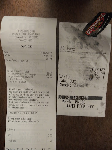 Read moreAfter 25 min of trying to get an order placed online failed, we called and were told to pickup in 25 min. When I got there the pickup line was empty but I was told to wait behind a long line of orderers b/c there was only one cashier open. I refused. No sub is worth waiting an hour for -- and the workmen at our new house had been waiting an hour for lunch before raindrops started again. If I can get in and out of Subway in 5 min, is Firehouse worth more than 10x the wait?!?! Worse was the attitude of the cashier, who told me to call corporate b/c they had no control over online nor any way to report the problem up the chain. So I reminded him and everyone within earshot (staff and customers) that we all have control over where we choose to eat...or not. You can be sure not to get any more large or time sensitive orders from me. I tried placing the order 30 min in advance -- instead, by time I got home with food 90 min had passed. What does Corporate have to say...