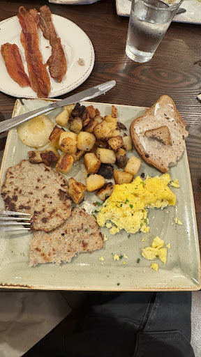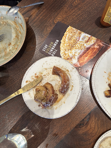The restaurant is not busy but a decent amount of people. Plenty of staff, kitchen staffed. Along with our entrees we ordered a side of English muffin with jelly and a cinnamon roll. The English muffin didn’t come out until I had to flag our waiter for it. A few minutes later the English muffin came out with what looked like frosting, and the cinnamon roll came out with gold sprinkles on it but no frosting as they have pictured everywhere. The white goop in the English muffin was very sweet icing or frosting as I smelled and tasted it.