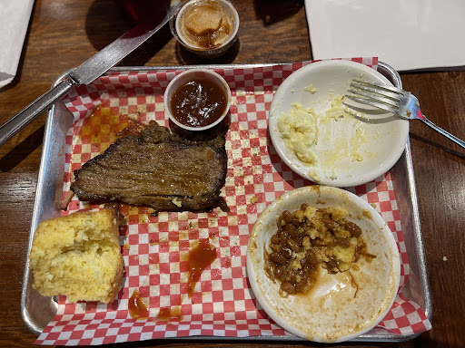 Chicken was surprisingly tender. Tasty. Not spicy. Perfectly cooked. The sausage was one of the better ones we have had. The pulled pork was tender and not spicy as well. It was perfectly cooked. The brisket was good but I think the chicken and the pulled pork were a bit tenderer. We do not think the meat was really seasoned but since we used sauce with the meat to eat it with it didn’t really matter in the end. I used the honey bbq sauce and it was awesome. The baked beans had a bit of a kick to them, jalapenos in them we think. Fries were OK but not crispy. Kind of soggy actually. They did not cook them long enough. Ketchup saved them a tiny bit. Yummy cornbread combined with the honey butter – very tasty. He said the cornbread was a little dense and a touch dry without the butter.
