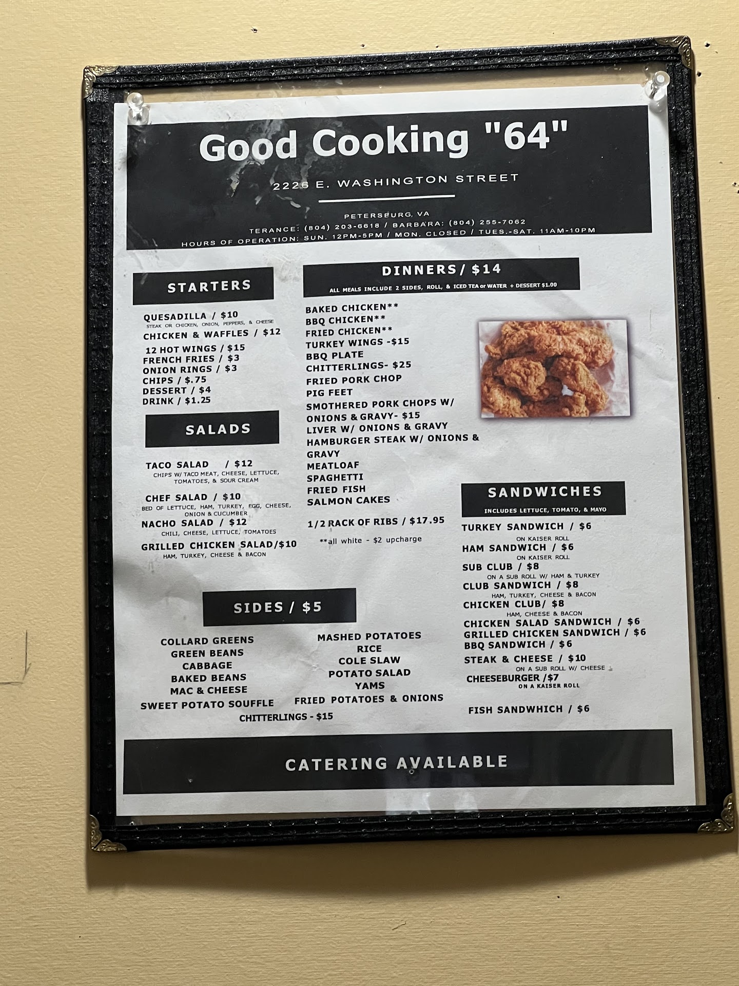 Read moreI found this little place while searching for Barbeque in Petersburg so I decided to try it out.. MAN the food was excellent!! good soulfood.. I got the Barbeque and also went with the meatloaf which both came with two sides, cornbread or roll and a 12 oz. Drink.. unfortunately they were out of mac& cheese but the collards and potato salad that I got was mouth watering!! if your ever riding through Petersburg Virginia on route 36 near Fort Gregg-Adams stop by and try a lil something you'll be...