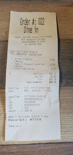 Read moreWe were passing thru and passed by, looked it up and stopped for a late lunch. We'd never been here before so took a moment to figure out what to order. I decided on the chicken and waffles, medium & my spouse got the chicken tender meal with fries, medium combo. We also tried the funnel fries. So the MEDIUM chicken was a HOT, HOT flavor. đ„ I normally order hot stuff but since I hadn't tried this I cautioned and got medium. My mouth was on fire, especially because I didn't like the waffles. They has a weird texture and no flavor. So I told the guy at the front I didn't like them, could I swap fries and he plain out said no. I also told him (didn't ask for anything) that the wings weren't medium they were hot, and he said here in VA they are medium. I just said ok. We took them togo because we couldn't eat them like that anyway. We didn't like the texture of the funnel fries but they were better than the waffle. Overall not a great experience. I mean I only took a bite and could've taken my whole meal back because it wasn't what I expected but I didn't want to so I just asked to sub fries and the guys response made it a probably won't return type of visit. It's just like he didn't care and he definitely seemed like more than the cashier but not thru actions if that makes sense. Learning we never ate there he could have stated the spices are spicier than most levels. And NO FORKS OR KNIVES to eat with. How do you eat waffle without and I feel like he could've said that from the beginning, I wouldn't...