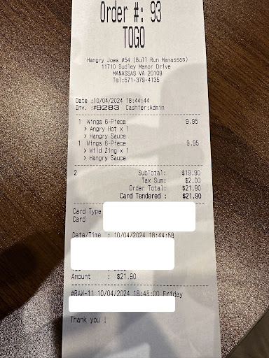 Read moreHangry Joe’s Hot Chicken Wings is hands-down one of my favorite spots. The moment you walk in, you’re greeted with a warm, welcoming atmosphere—beautiful decor, uplifting vibes, and staff who go above and beyond to make you feel at home. Their customer service is truly exceptional, which makes the whole experience even better.