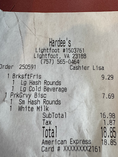 Read moreThe food was very good, especially since I don't have a Hardee's where I live. But service was lousy. The lady who waited on us at the register wasn't very helpful or hospitable. You could tell she really didn't want be there. My wife didn't get honey mustard with her chicken tender meal, so she ask for it. She said the lady looked at my wife like my wife killed her dog as she handed her the mustard packets. I went up to ask for ketchup packets and she gave me a look and handed me about 30 packets. WHO USES 30 PACKETS OF KETCHUP?!? The customer service isn't really a priority. Overall, the restaurant was dirty, not filthy dirty, but like it hadn't been kept up that day. The ac didn't seem to be working and the were buckets placed the restaurant. I would visit there again, but i would hope they've improved...