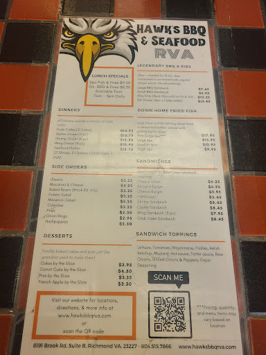 Read moreAlways heard good things about this place, mainly because of their fish. But it's called Hawk's BBQ, so I decided to give their barbecue a try. Needless to say, I was not impressed. I went to the location on Midlothian turnpike. I came in and there was a single old lady slicing and packaging a piece of cake. She said nothing to me until she had finished. Then she simply stood at the register and asked what I wanted. I ordered the small BBQ sandwich (cole slaw & hot sauce) lunch special, which included fries and a drink. Total price came out to $7.50 plus tax. Took about 5 or 6 minutes for the food to be ready. The drink that comes with the lunch combo is the smallest size they have. You would think for $7.50, you could at least get a medium size, if not large size drink. The fries were nice and hot and tasted ok. The sandwich was rather small. i mean, it said small sandwhich combo, but for $7.50, I was expecting a bigger small sandwich. Tastewise, it was unimpressive. Not really sure if they are supposed to be Carolina style or what, but i would not go back (for the BBQ). There's a place about a mile or 2 down the street called Q that serves a much larger and better tasting sandwich for a similar price and the drink refills are free. Even the BBQ sandwich at Cookout was better tasting and...