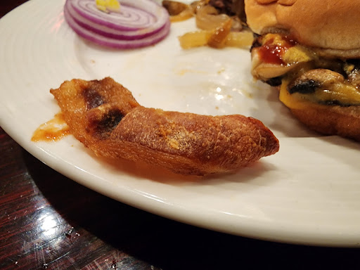 I unfortunately did not think to take a picture of the raw burgers, but I am including pictures of the second round of nightmare burgers. They microwaved the same original burger patties to heck and back. Our burgers were just obliterated and they somehow only took a couple minutes to come back to us. They'd have required at least 15 minutes to be that well done on a grill. They were so cooked that the beef was bending up at the edges and rubbery. My husband's bacon was unidentifiable (pictured). Yes, that really is a piece of bacon....