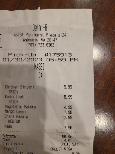 Read moreWas shopping at the Ashburn Lotte and decided to check out nearby Delhi-6 for some Indian food. They did not disappoint! We had Lamb Korma and Lamb Chop Masala. If you like lamb, these are great options. The Lamb Korma gravy topped with chopped cashews was rich and creamy. The pieces of lamb were tender and delicious. I doused the gravy onto my rice and enjoyed every mouthful. The Lamb Chop Masala was totally worth the price. They first put the lamb chops in the tandoor and then added the masala sauce on top. Biting into the lamb, you first encounter a crispy crust on the outside before sinking your teeth into the moist, tasty meat. That was the first time I had lamb chops like this and I enjoyed it tremendously
