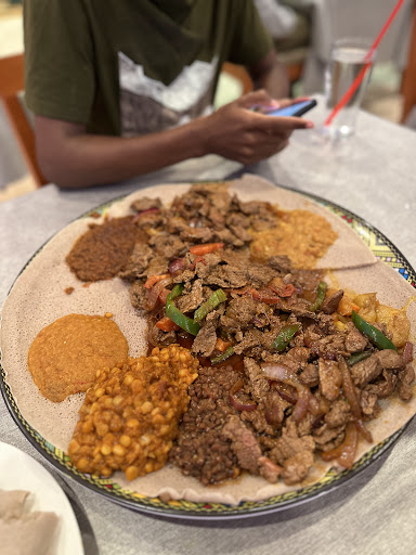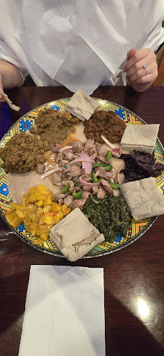 I had ordered awaze tips with lamb in sauteed red chili pepper sauce. I unexpectedly ate with my hands. The meat portion was warm but the plate, flat bread (injera), and side dish of chopped beets, jalapenos, and onions were cold. I find that odd to eat on a cold plate. I won't eat the same dish again because the lamb was more gamy and I had a terrible breathe for the entire day. I can handle spices up to habaneros level, but wasn't my concern. The dish wasn't tasty. It was filling but not tasty.