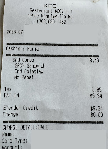 Read moreIf one would have told me a year ago that I'd be leaving a negative review for KFC, I would have responded, " you are out of your mind". I've been extremely vocal about the Popeye's vs KFC taste debate that's been brewing the past couple of years. I've been loyal to KFC. Until this past labor day weekend. I visited the Woodbridge, VA establishment and EVENTUALLY threw away the chicken (unheard of in my world). The chicken was bland - YES BLAND! Zero flavor - as if the forgot to add seasoning to the chicken. Also, the chicken seemed as if it wasn't cooked enough. All in all it was a horrible experience. Enough for me to not EVER go to another KFC - which breaks my heart. ...