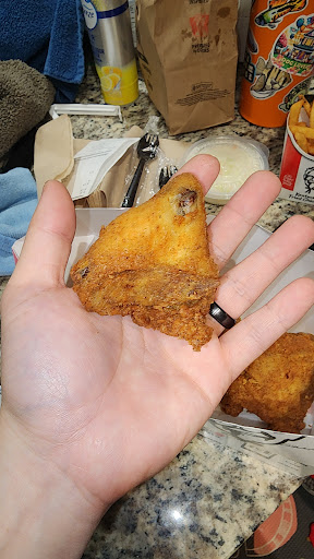 Read moreUsually pretty good food. Usually I'm not picky when it comes to that, but value is something I have to complain about. Blah blah something something inflation, shrinkflation, prices, etc. Aside from prices going up, portions seem to be going down. Maybe that's my imagination here, but for sides like potatoes, corn, and gravy, they should not be $2+ for a small cup. The attached pictures is one of the pieces we got in our bucket, and no it wasn't one that was thrown in as a freebie. It was actually part of the counted pieces, and mind you that I'm not a big person at 5' 6". I get not every piece of chicken can be huge but giving tiny pieces is a rip off. Not every piece was tiny but none were actually huge to make up for it. For the price and being fast food, it's no longer the value it used to be and not really worth it. Additionally we were supposed to get 4 biscuits but only got 2. We also didn't get potatoes but did ask for gravy for the biscuits, which was an extra charge. That's fair, but it was like $3 for a small cup of gravy. That's ridiculous.