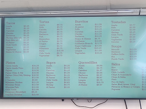 You can order carne asada, chicken, carnitas, barbacoa, beef tongue, shrimp, or fish tacos; all tacos are served with cilantro, onions, and lime. You can also get hot sauce. I like the carnitas tacos the best. I've also tasted their seafood soup, which was very good too. Huge portions of seafood in a giant bowl of soup for only $11.75.