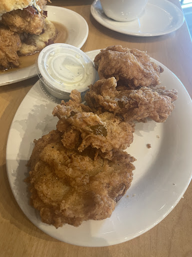 Everything was great! The chicken was juicy and crispy. You can tell they make it here. The fried green tomatoes were thick and came out hot. Served with a side of buttermilk ranch. The biscuits are very flakey. The grits aren’t your traditional type of grits. Super creamy, not very grainy. They are still good - but not the traditional grainy grits (if that makes sense lol).