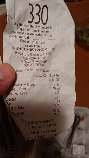Read moreI just visited this McDonald's today and have visited it on several occasions. They constantly undercut the order.You pay for something they don't provide it. You ask for something they don't get the reason why you're asking for it. I ordered a large fries today. I got the large fry container but enough fries for a small one. Previously, I've ordered cheeseburgers. Asked for no onions, no salt, extra ketchup; I get a burger with no ketchup at all.... Just had another visit. I don't understand what's so difficult about putting extra catch up on a burger... Ever since covid , all service workers at fast food restaurants like mcdonald's and burger king Just don't give a shit anymore. Maybe higher people that really want to work and can speak and read english.. The owner of this store should feel ashamed. The quality of mcdonald's is what makes McDonald's. Both burgers were not supposed to have onions on them.One has onions on them.Thank you very much for not caring about your customers. I wish corporate would take away your ability to run the store or come in and take over your Staff needs to Change either get better or Go work...