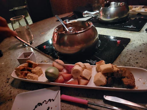 If you do the four courses, your first course is dipping bread, etc., into hot cheese. Next is salad in a bowl. Then is the main course. That's similar to hot pot where you cook raw ingredients (e.g. meats, vegetables, seafood, etc.) in your choice of broth (or similar). They provide a table of cook times so that you don't undercook anything. You also want to be mindful of which prongs you use for raw ingredients and not reuse them for touching the cooked ingredients. In other words, don't let the raw food [directly or indirectly] touch anything going in your mouth. I noticed another review below complaining about food poisoning and they blamed it "bad cheese" or something like that. But obviously they just weren't careful enough with handling the raw meat. The last course is dipping fruits (etc.) in heated chocolate. And they also have macarons, mini-cheesecake bites, etc. for like $3 extra each.