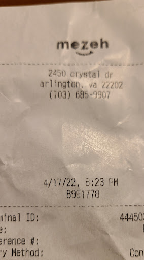 Read moreThe food at Mezeh in Crystal City was fresh and flavorful. Our son, a die-hard fan of Roti, decided he loves Mezeh even more. Unfortunately, the service was so poor that we will never return again. The woman who "helped" us did not smile once. She seemed annoyed that we did not immediately know what we wanted. There was no one in line behind us and we did not take an excessive amount of time to decide. She rang up our order and left our trays of her side of the counter, so we had to reach back in the food prep area to grab them. We sat down and after looking at my receipt I realize we were charged for a drink that we did not order. I went back up to the counter and instead of offering to refund my money she just asked if we wanted a cookie instead. When I told her know that I would like a refund she again seemed annoyed. She handed me the refund and I asked for the receipt as I always try to verify that my credit card was charged correctly. She said she needed to keep it and I asked for a copy. She printed one, handed it me and, without a word,...