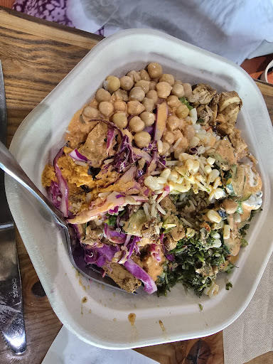 He loved it! The decor, atmosphere, and especially the food. Green salad with some cabbage, chicken, and falafel. I added more to my bowl. I like that everything is labeled so I dont have to keep asking what it is.