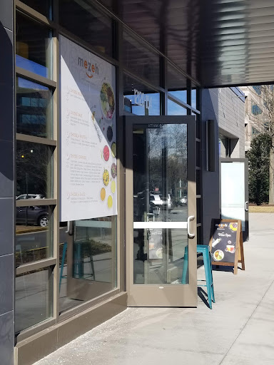 The place was mixed review. Should not have high expectations. Thought very highly of Mezeh in Fair Oaks Mall. Drove here to Reston. Probably that was mistake to set expectations. It's in office park type setting off a road, parking lot and office buildings. Did not see any outdoor seating. Not much room from road. About 8 feet? That makes the ambiance very office lunch feel. Industrial! Would suggest more decor inside and maybe some tint on glass, some light music? Did not work for us as a place to go to. If there its fine and perfect. Ie, very office feel. The food tasted stale Friday afternoon at 1. Did not have the fresh zesty taste of the other Mezeh. Tasted a bit old. The falafel was crusty and crispy a bit undercooked almost raw inside. Like they cooked fast! But not through. The staff was mostly ok. The first lady who made the pita. Was a fill in for others on break. She threw 3 pitas as she did not cut correctly. She got the 4th cut correctly and we moved down the line. Poor lady. The seating was ok. Adequate. Ambiance was industrial. Ready to leave after eating. They left the door open with barstool. Not clear. It was 50 degrees. Not too hot. Really made no sense. People had jackets on inside. After 20 minutes you notice the temperature and weird wind flow with door breeze and road sound? Not wanting to hang on. It was ok. Felt very office lunch spot. Again we drove there. That meant we were expecting something fresher. Not bad. Could be better. Won't drive to this location again. If in area...