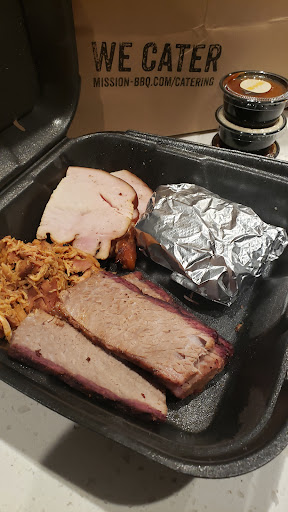 Mission "sauce " BBQ. I have to agree with 1 review posted about the dry brisket. If you get the lean cut, I guess it's best to get the brisket earlier in the day. The 3 meats lacked flavor and depth. You can smell some smoke and taste a hint of smoke but that is all. Does the brisket have any seasonings besides salt? Maybe some brown sugar, black pepper or vinegar?