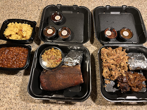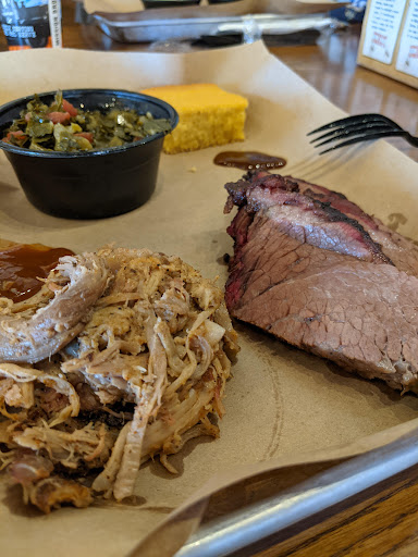 Read moreI don't normally like BBQ but it was two against one (I wanted steak), so I gave it a try. The food here was great, but the sauces are out of this world! I wanted to take all the sauces home to dip everything in my house into them!!! I had a double meat platter, pulled chicken and the lean brisket. The lean brisket was tender and paired very well with the Texas style sauce, (it was like steak and A1, which was what I wanted) so good! The chicken was best with the sweeter spicier sauces, I can't remember the names. I wish I had taken pictures, even the spicy sauce up by the soda machine was awesome. The slaw was good, but the fries were just a little over cooked for my liking, not complaining though, I just like my fries really soft, and the ones that were soft were great. The cornbread is amazing! I would love the recipe and step by step instructions, please!! It is so crumbly and soft and has the best flavor! My husband and his brother really liked the mac and cheese and the pulled pork. We are heading down this way again for another concert, and we will definitely be here again to sample more meat and sauce combinations and to try the rest...