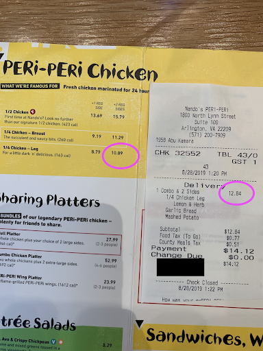 Good food; incompetent service. Just finished lunch at this Nando's location with a co-worker. I ordered the 1/4 Chicken (Leg) w/ 2-sides - $10.89 per the menu (see attached picture). I was charged $12.84. Before the order was complete, I questioned the server on the price (which appeared on the customer-facing POS display) - she informed me the higher price was the grand total - all tax included. But, I was ultimately charged a total of $14.12; sub-total $12.84 + $1.28 tax. Sub-total should have been $10.89 - per the list price of the single menu item I had ordered. I presented the printed receipt to the cashier, who insisted the $12.84 price was the menu price with tax included - but she didn't seem to understand the bottom portion of the receipt - which clearly identifies the sub-total + tax amounts and the grand total. She proceeded to summon the manager over - who came by after a minute or two. The manager told me the same thing. With both receipt and menu in hand, I pointed out that the menu price was $10.89, but was charged $12.84, and subsequently charged tax off of the incorrect, higher amount. Saying the same thing the cashier did, he told me the $12.84 was the total w/ tax - ignoring the bottom portion of the receipt that had the tax amounts and grand total itemized. He asked me if I wanted a refund, and I said that "I would like to eat there, but request the $2 refund that I was improperly charged". He proceeded to open the register to hand me a bit of change (coins) - I think it was about 20 cents. And I said "no - I want the $2 difference that I was over-charged". The manager, still not understanding my concern and the blatant discrepancy, begrudgingly handed me $2 cash. Both the cashier and the manager were quite unpleasant during the entire confrontation. In both cases, I politely identified the discrepancy - with menu and receipt side-by-side. Unfortunately, both these employees just didn't understand the mistake - or were knowingly trying to rip me off. Giving them the benefit of the doubt, I'll write it off to ignorance to simple arithmetic. Neither of the employees seemed interested in correcting the customer's (my) concerns. But they did - much to my (and likely their) frustration. I say "their frustration" too, because they just didn't understand the difference between a sub-total, itemized tax amounts, and a grand total. Due to my little patience for incompetence and unfriendly service staff, I'm afraid I won't be eating here again, despite their food being pretty good. The food was good in this visit as well, and the meal was prepared according...