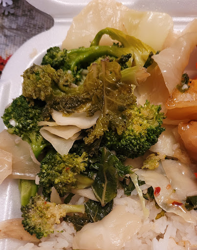 My hubby brought me a plate with half white rice/ half vegetables, orange and sweet fire chicken. The chicken was great except for the last piece, which was very old, and couldn't be chewed. The vegetables were awful. I wanted just 4 or 5 pieces of broccoli. The lady serving him refused the request. Instead, I got a side with lots of cabbage, a little broccoli, and some leafy greens. The broccoli was mostly old, and so were the leafy greens. They were mostly olive in color instead of bright green when fresh, and the whole vegetable side was overly salty. If people don't want the vegetables, they should be discarded and not sit there to get old looking and tasting. This should also be balanced and not mostly cabbage. And she put so much on the plate that half was under my chicken, which ended up being a smaller than normal portion size. Finally, the servers need to be friendlier instead of rude. I am not sure I want to go back to this restaurant. I never have issues like that at the...