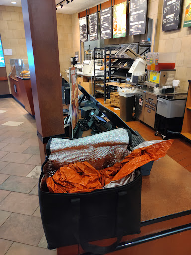 An bizarre lunch at Panera! We ordered from the somewhat confusing overhead menu. Our questions were answered briefly with a somewhat curt reply by the counter associate. Food was ready in a timely manner and picked up at a window. My order was incorrect and was rectified with a return trip to the pick-up window. I had no utensils or napkins, so another trip to the window was needed. I was informed that the napkins were low in supply, so I was only given one per person. Our table was the nearest table to the beverage area. We heard a noise, and the lemonade-tea machine was emptying, pumping sticky beverage all over the counter, dripping down the cabinet and heading straight for our table. We alerted a staff 6 set out chairs around the ever widening area, but no one was able to get their beverages. Finally, a staff member appeared with a wet-dry vacuum while the machine continued to empty. An older diner became upset and berated the staff for using the loud vac and disrupting his lunch, obviously not sensing the reason for the vacuum. Back to lunch, I discovered a hair dryly stuck to the inside of my soup bowl! Another trip to the window, where I was given another bowl of soup, which was very delicious and hot. I inquired about a to-go box while back at the window but was told the restaurant was out. The staff wrapped my untouched sandwich and bagged it for me at the window. Overall, the food was good, the staff were fair in executing their duties, and I grew very embarrassed with my continued need to go to the window on countless occasions.
