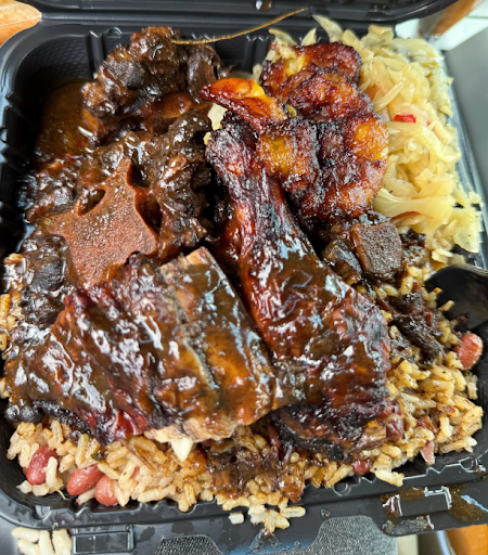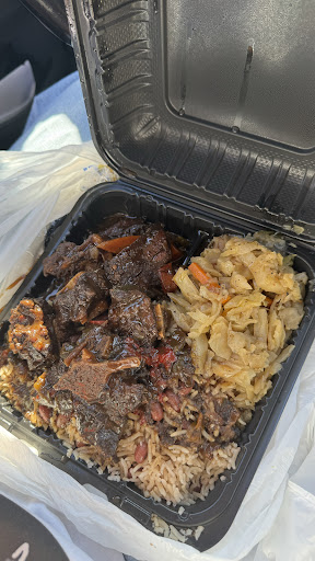 I got Oxtails, Curry and Jerk Chicken all with Rice and peas and cabbage with coco bread. This food is so good!🔥🔥🔥