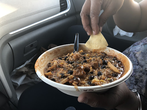 I ordered mine inside of the Tortilla Bowl, Rice & beans, ground beef, soup, spicy queso, peppers & onions, guacamole, salsa, Pico de gallo, cheese and cilantro. It was absolutely delicious.