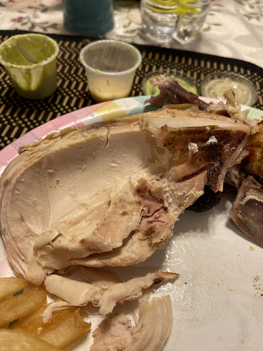 The chicken had a beautiful herb-like taste to it. The chicken skin was soft and easily torn apart. The chicken meat was tender and able to be pulled away easily, while at the same time remaining juicy and flavorful. The pieces included in the half chicken were the leg, thigh, breast, and wing.